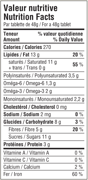 Dans son alliance avec le chocolat noir aux notes florales Alpaco, et avec le chocolat 70 % légèrement acidulé St-Domingue, le goût de noix grillées de l’huile de caméline est mis de l’avant.